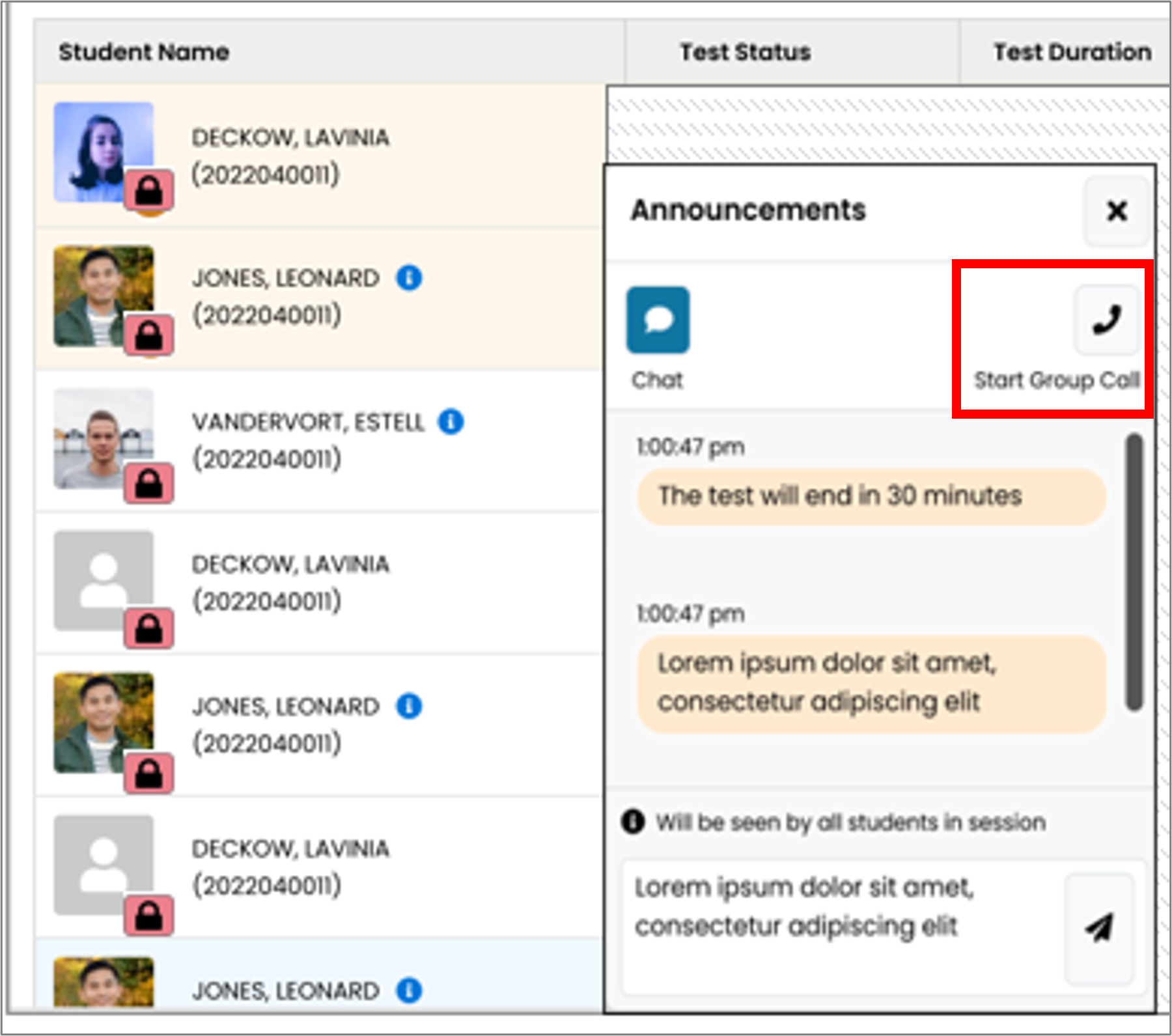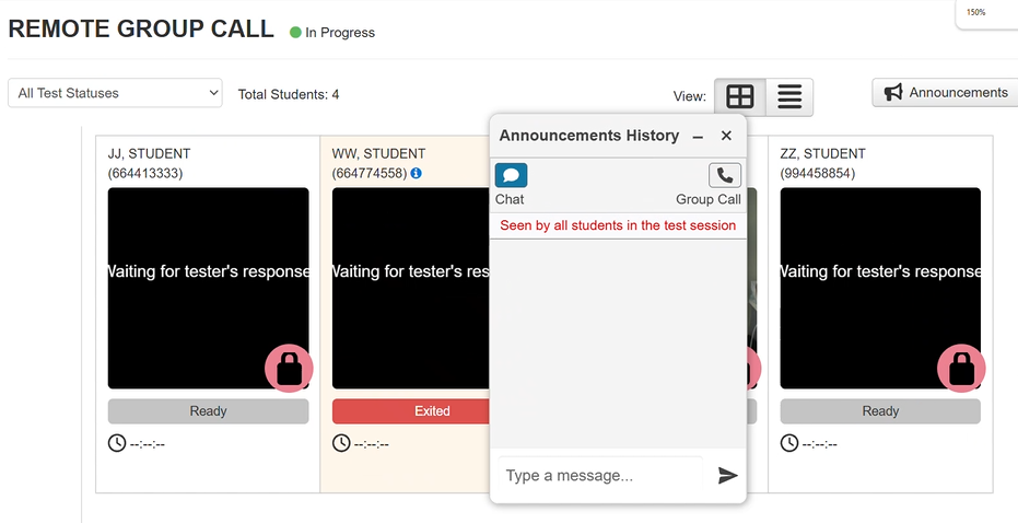 There are additional steps for the proctor before students can enter their test. All testers will show as locked on the test management session screen. The proctor can begin the group call using the Announcement widget Start Group Call button.