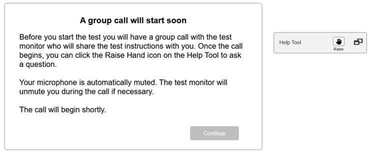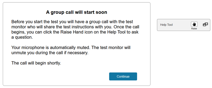Once the proctor ends the group call or individually unlocks a specific tester, the tester’s Continue button becomes enabled. When the tester presses the Continue button, they will proceed into the test.