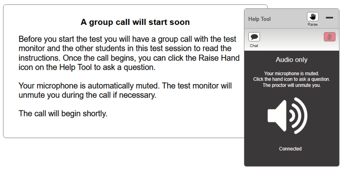 When a tester receives the group call from a proctor, their Help Tool widget opens, and they are brought into the group call. The tester is muted. They can raise their hand if they need to communicate directly with the proctor. The proctor can individually unmute testers for discussion.