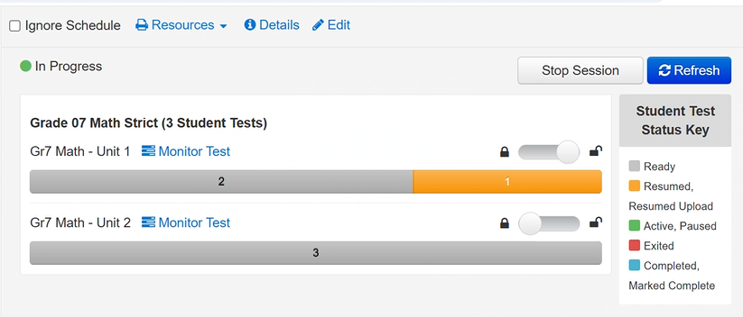 You can start a session to make a test or test unit available to students in the session. Then, you can unlock the test or unit to give a student access to it.