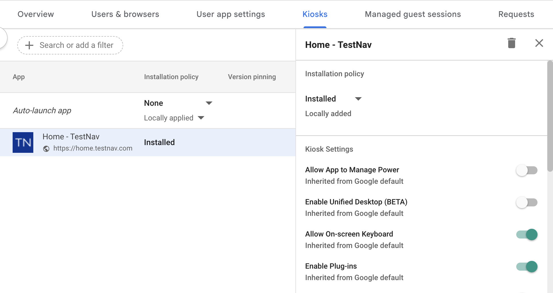 - The new TestNav Web App for ChromeOS and its extension will now be installed for users in the selected organizational unit as a kiosk app the next time they start their ChromeOS device.
