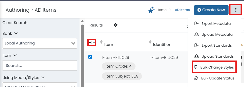 Permissioned users can bulk remove styles from the item list interface. The style must already be set up in AD Authoring > Media/Styles.
