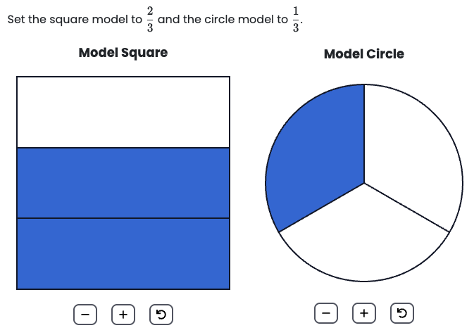 Authors can configure several fraction models within a single interaction, displayed side-by-side. Models are scored collectively, and partial scoring is not yet implemented.