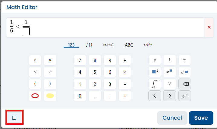The Math Editor supports the creation of math test items. Math equations created with the editor will resize much better than those inserted as images from another source.