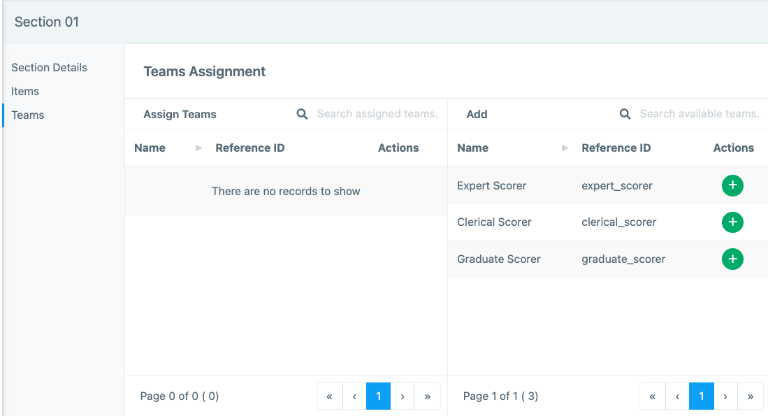 A section is a grouping of one or more items. By creating a section, you can assign a Team of specific scorers (users) to score an item or group of items. Only users in Teams assigned to a section are allowed access to score items found in that section.