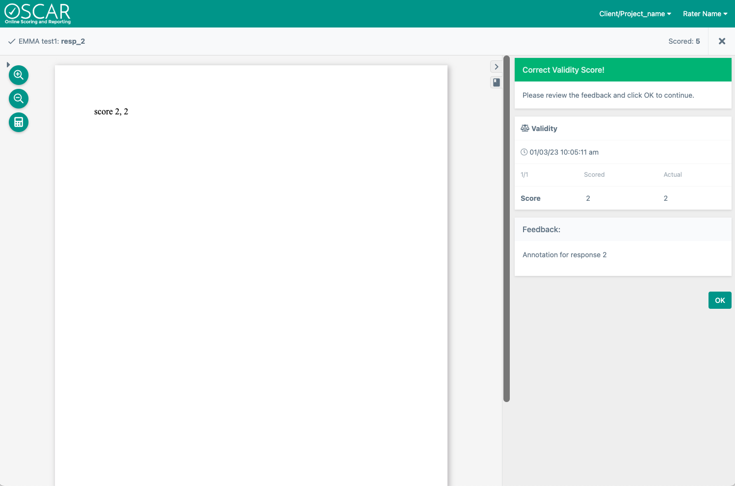A live item you are scoring may have Validity turned on by a scoring administrator. When Validity is active, Validity responses will be presented during scoring at a variable rate (set by a scoring administrator) and will appear like any other live response. Unlike live responses, Validity responses are scored against a true score that is set by a scoring administrator. After scoring a Validity response, there may be an opportunity to review the true scores of the response. To learn about the specific Validity rules on an item you are scoring, talk to a supervisor on your project.