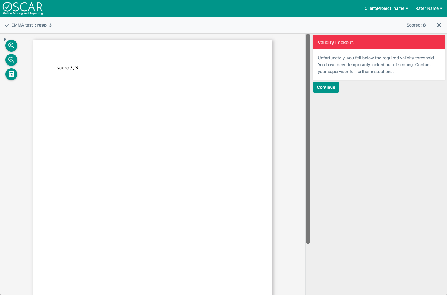 If a certain number of validity papers (determined by scoring admin) are scored incorrectly, your account could be temporarily locked out of scoring or you could be presented with a Calibration set. If you are locked out from scoring, you will need to contact your scoring administrator to determine the steps needed to activate your account again. To learn about the specific Validity rules on an item you are scoring, talk to a supervisor on your project.