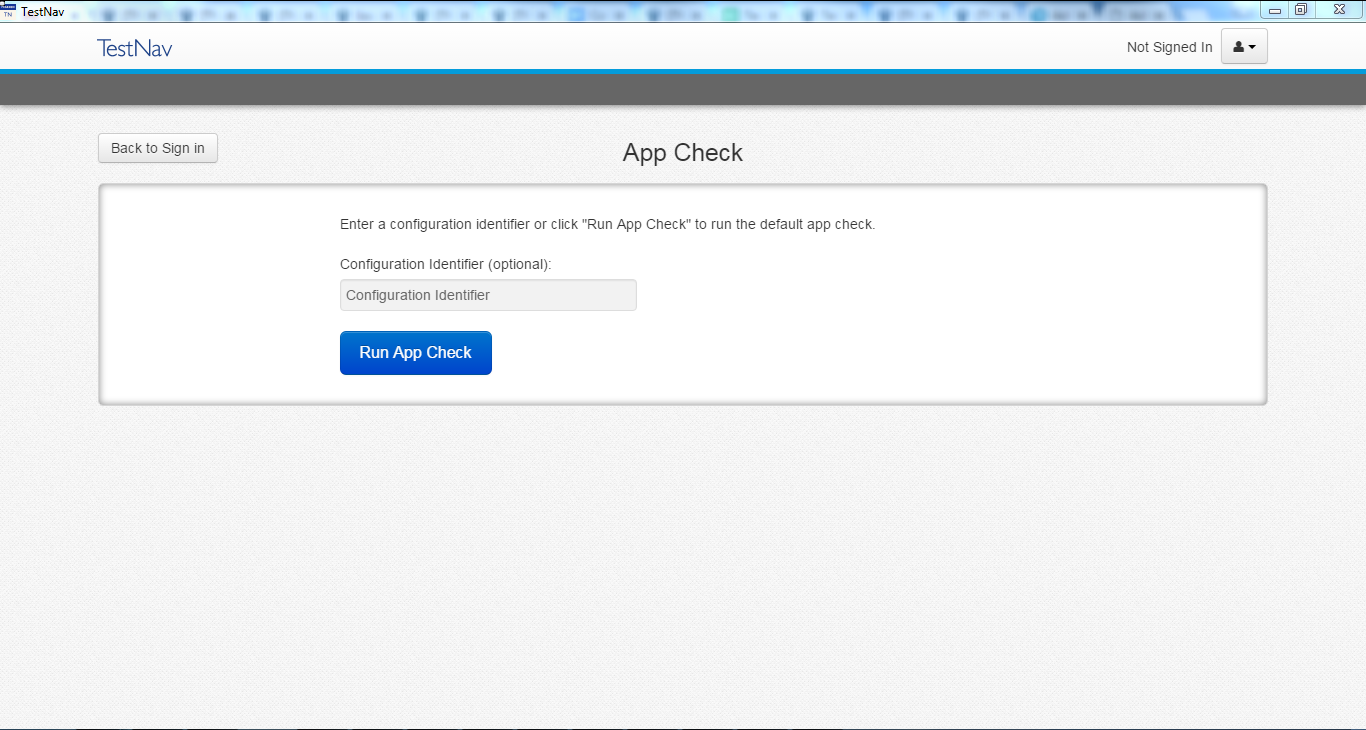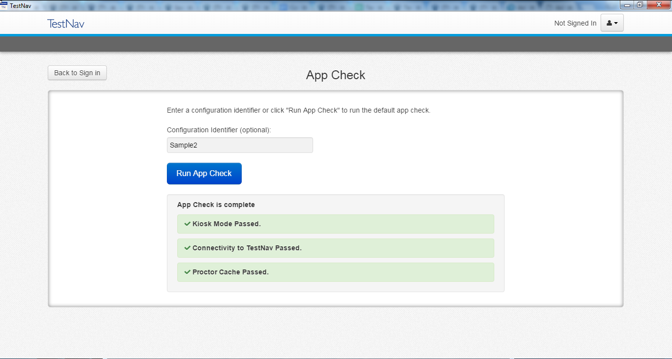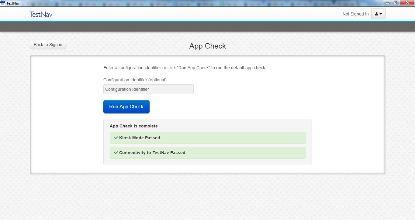 You see green checkboxes for Kiosk Mode Readiness and connectivity to TestNav, if the system passes. If one of these fails, you will see a Fail message and must check your connection and settings before running App Check again.