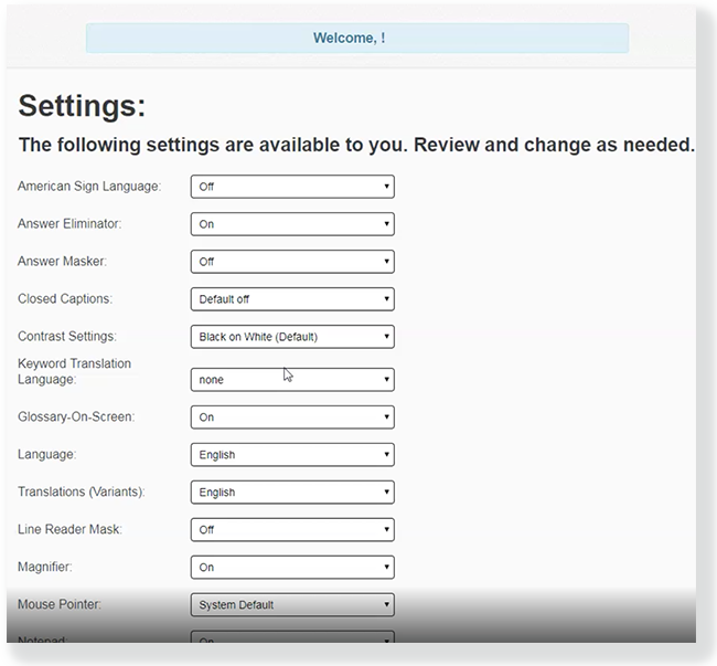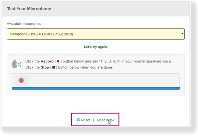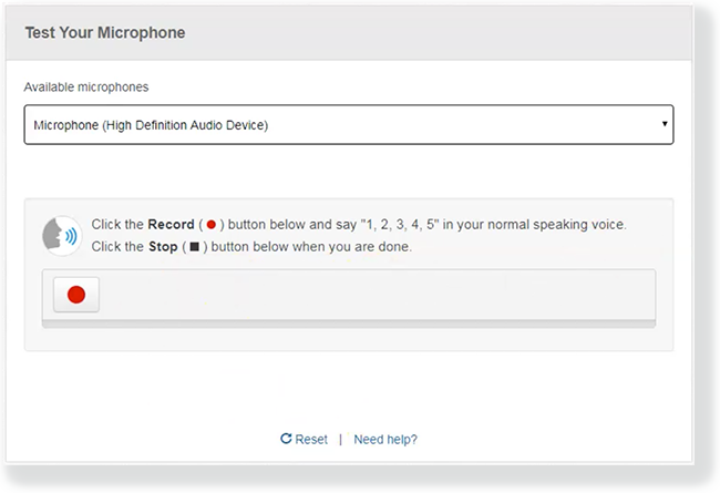 If the test requires audio, click Enable Your Microphone to set it up. Follow instructions to on the Test Your Microphone window to select an available microphone, record audio, and play it back.