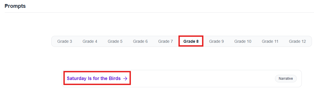 To see what prompts are available to students, select a grade and select a title. To return to the dashboard, close the window or just click outside the window.