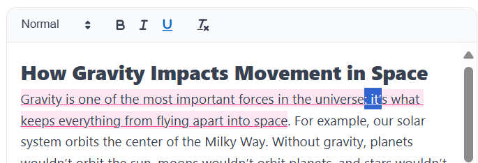 Below the performance levels are comments and suggestions. Select Show in essay to see highlighted areas needing work.